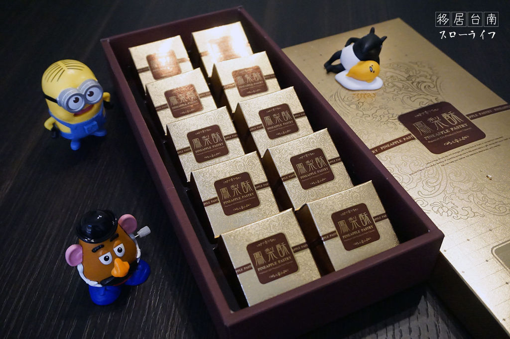 每一盒鳳梨酥裡頭有十顆鳳梨酥,為避免影響新鮮度,每個鳳梨酥都有自己的小盒子,小盒子跟著外盒的設計走,同樣不馬虎!