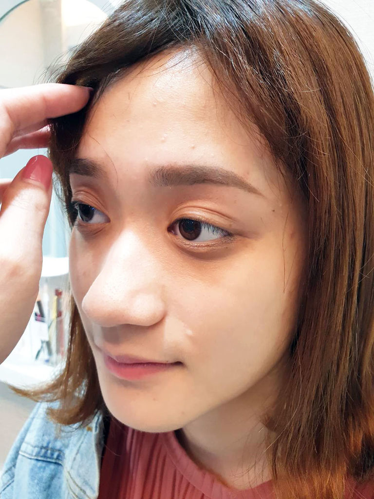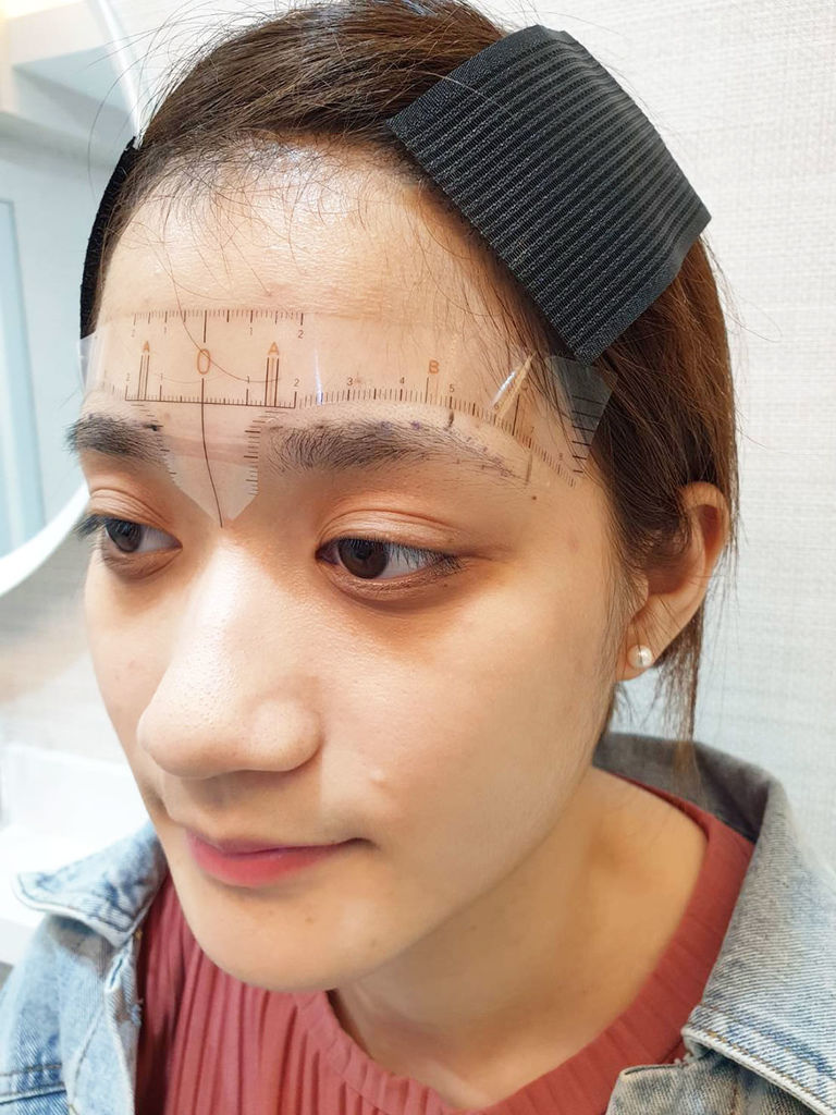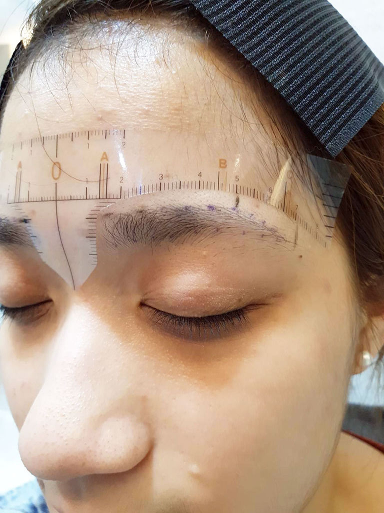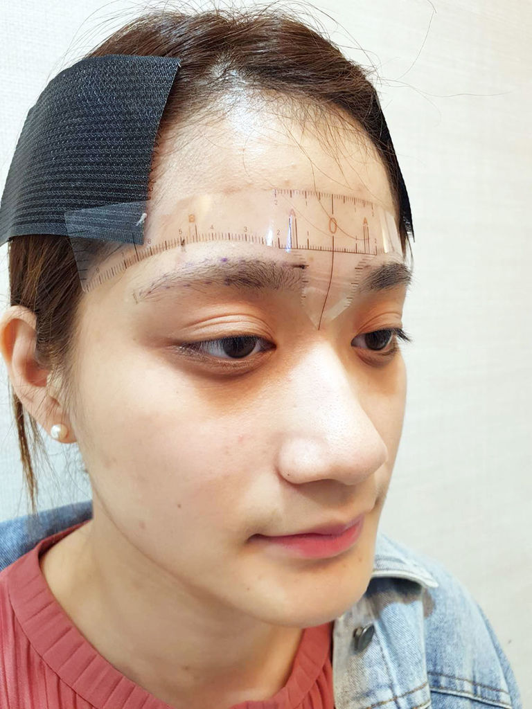 一開始老師會貼上眉貼,開始幫眉毛地位,眉頭、眉峰、眉尾,同時也跟好友講解她眉毛的流向、毛流!
