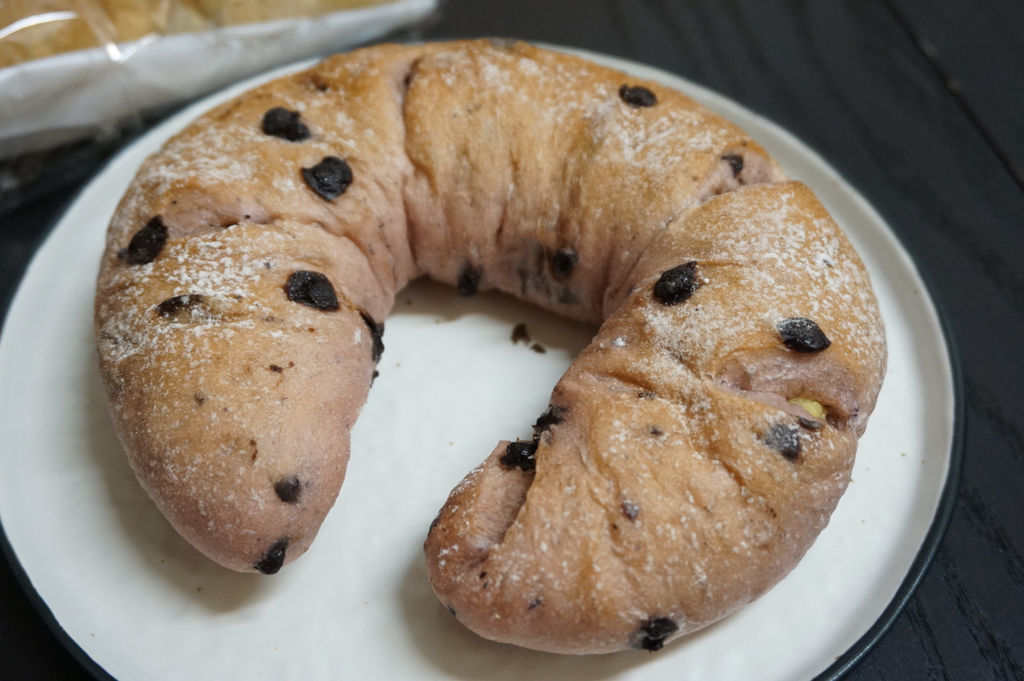 切開內餡就是卡士達醬,混合著巧克力豆跟莓果肉,麵包本身也是有加入莓果,咀嚼的時候帶出一點莓果香氣