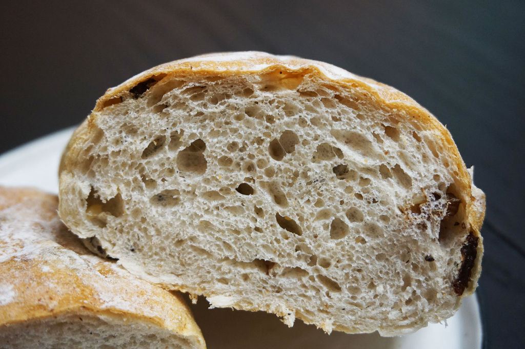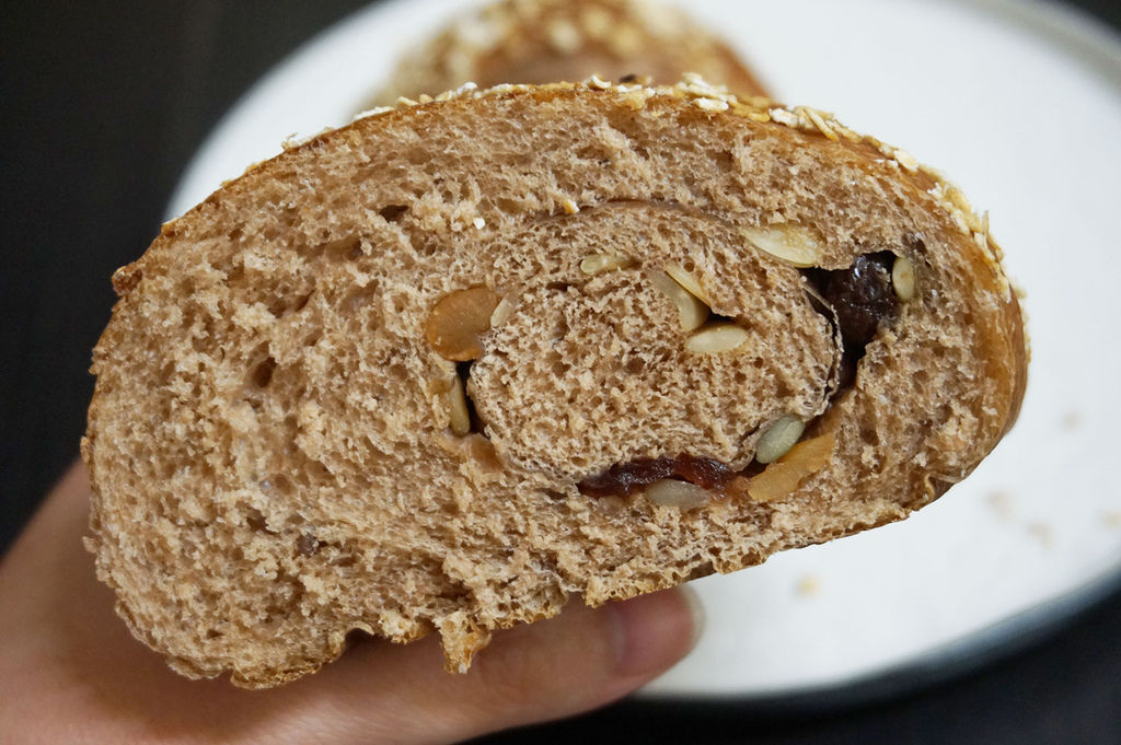 用全麥麵粉下去做的,多了麥跟胚芽的香氣,裏頭加入了不少堅果類跟葡萄乾,吃起來很有口感,堅果的香氣藉由咀嚼慢慢散發出來,葡萄乾更是我的最愛,甲上林的葡萄乾大而且還是充滿水分的,不會乾乾的,吃起來酸甜酸甜很迷人