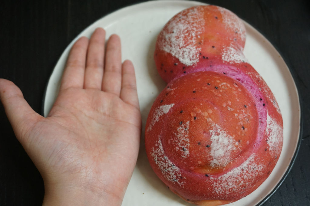 火龍之舞,聽店員說是店內的明星商品之一,以火龍果去和麵團,所以麵包呈現紅色,而且還帶有火龍果的籽,吃起來帶著果實的微微酸度,加上裡頭的起司有點鹹香,麵包口感較鬆軟,而且麵包吃起來是濕潤的