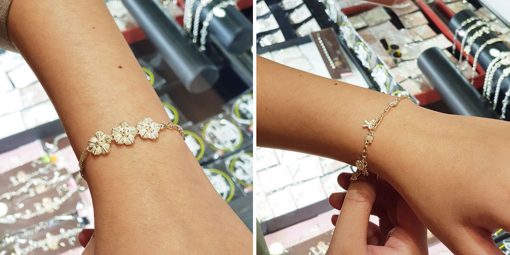 正當我準備要付錢的時候,男友也叫我挑一條,說要送給我!就當我們替彼此挑禮物~(那天不知道有多開心)又換我瘋狂試戴,試戴後因為真的太難決定了!最後挑了兩條手鍊回家XD